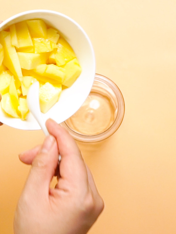 1.芒果切丁,倒入破壁機(jī)