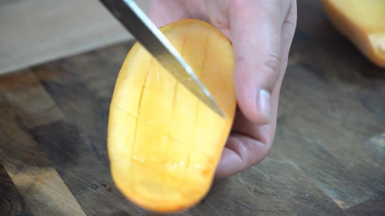 2.芒果對(duì)半切開再橫豎各劃數(shù)刀。